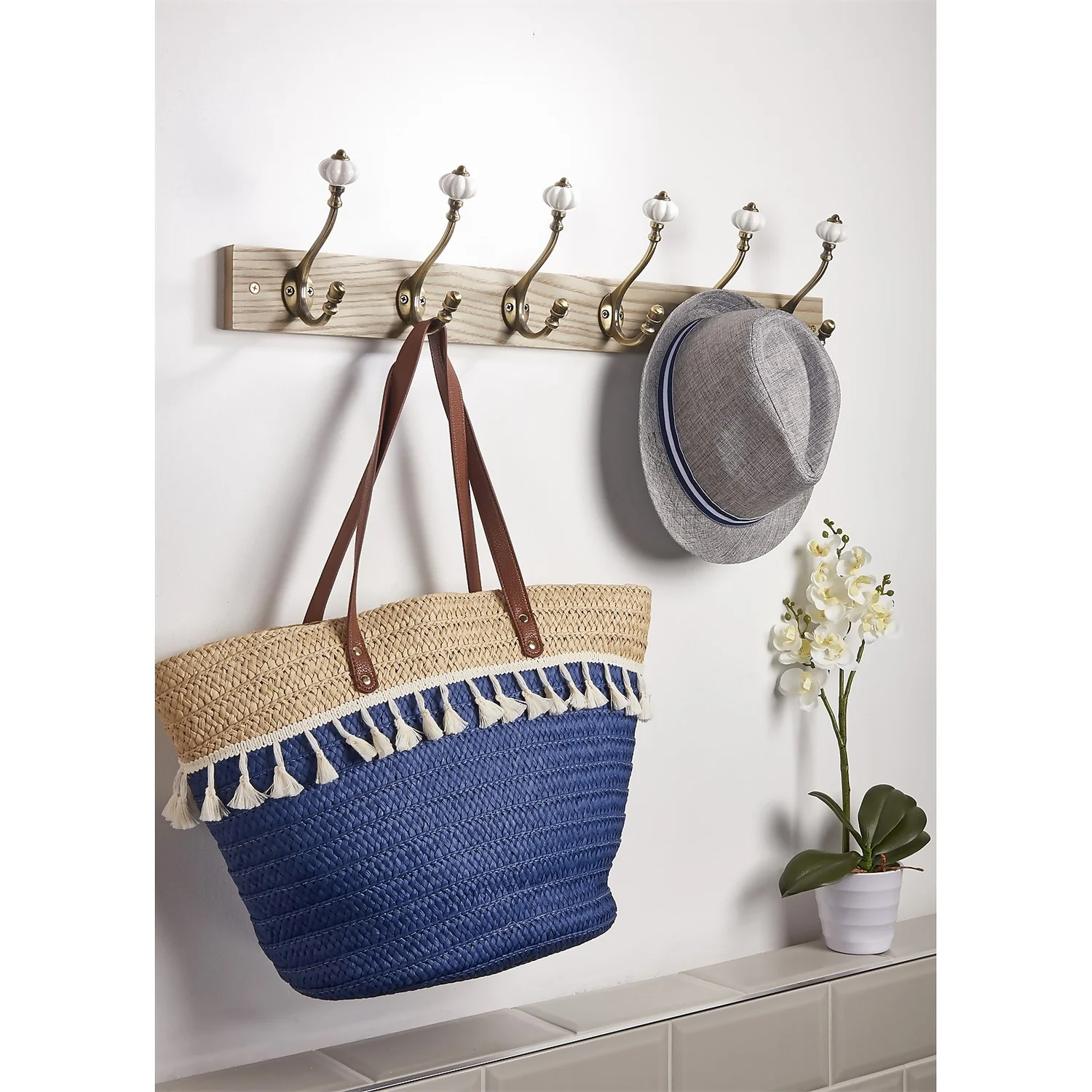 A rustic coat rail featuring 6 antique style double hooks with decorative ceramic tops.