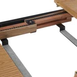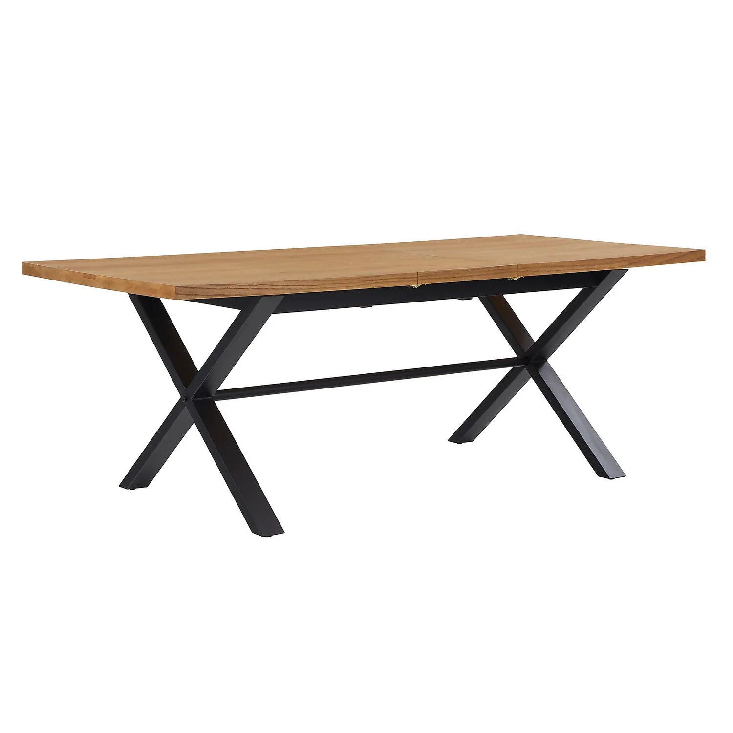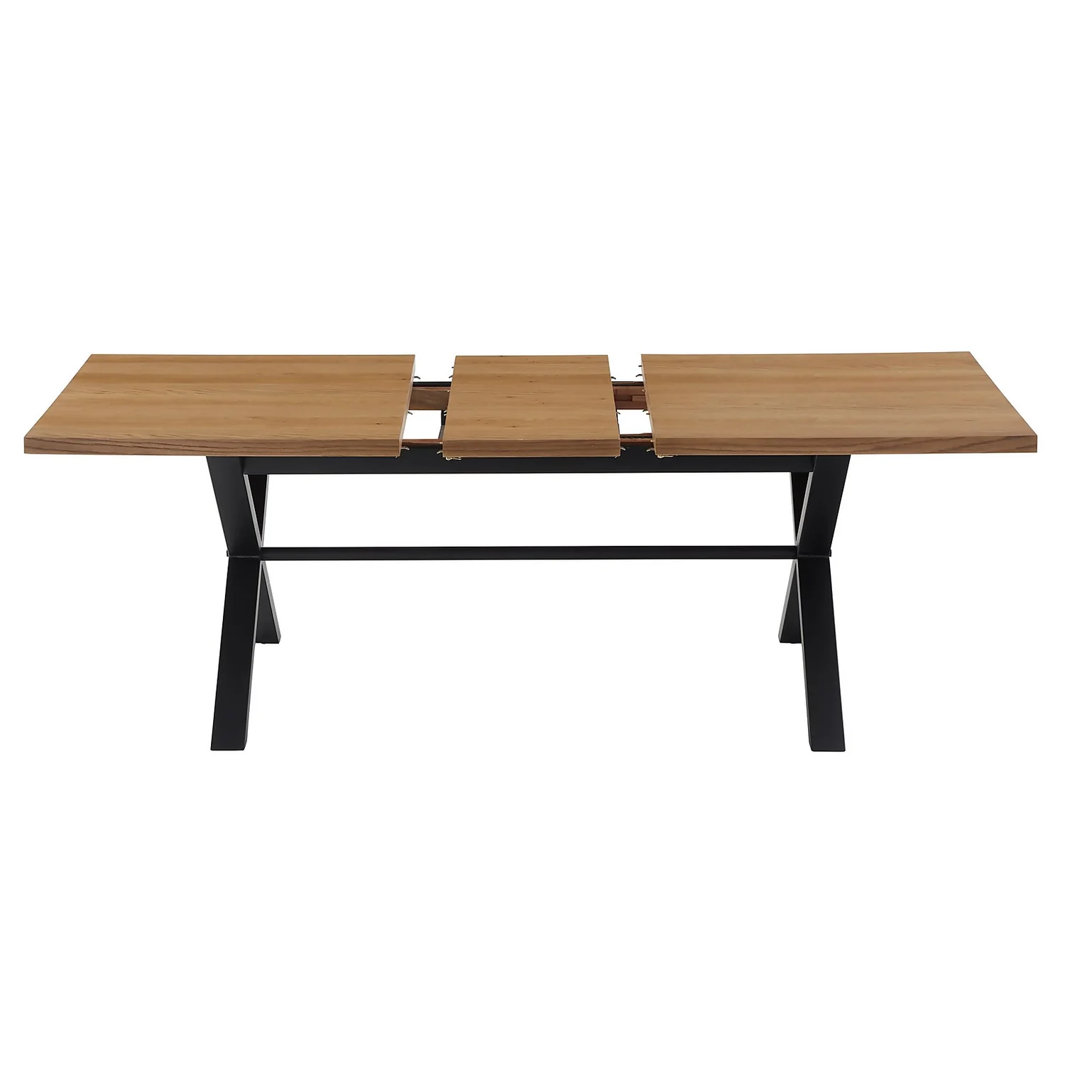 Beautifully-crafted modern and versatile extendable dining table combining a oak veneer surface with black powder-coated steel cross legs.