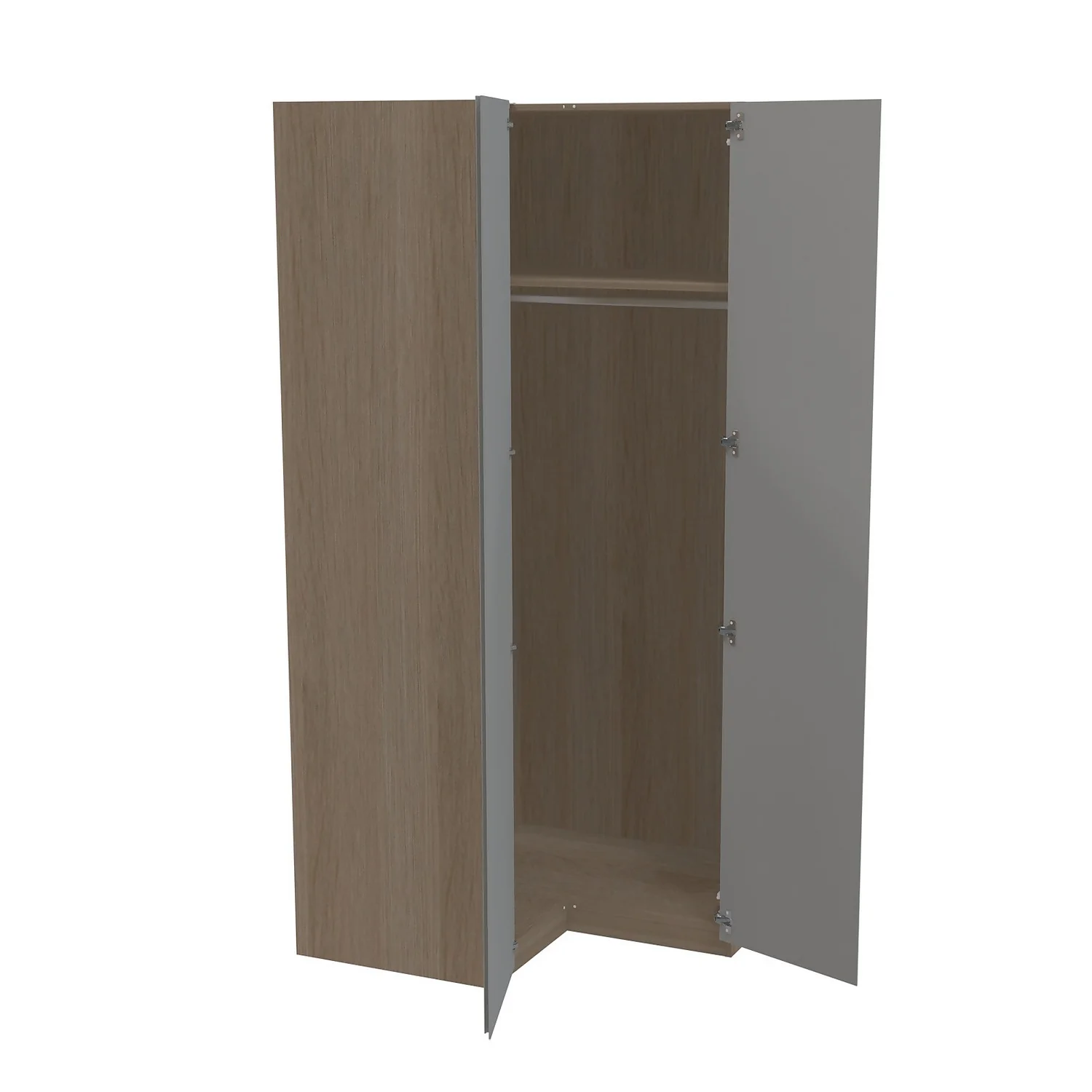 The House Beautiful bedroom range is exclusive to Homebase and offers a selection of different finishes and storage configurations to suit your needs. With a range of carcass colours and contrasting door designs, you can select the look to fit your bedroom aesthetic. This corner wardrobe (1 x double unit and corner conversion) features an oak effect carcass and beautiful gloss grey handleless doors for a modern sleek look. The wardrobe features premium soft-close clip-on Blum hinges, five shelves and a hanging rail. You can customise your wardrobe with our additional internal storage options (available separately) including internal drawers, shelves, dividing shelves and extra hanging rails.