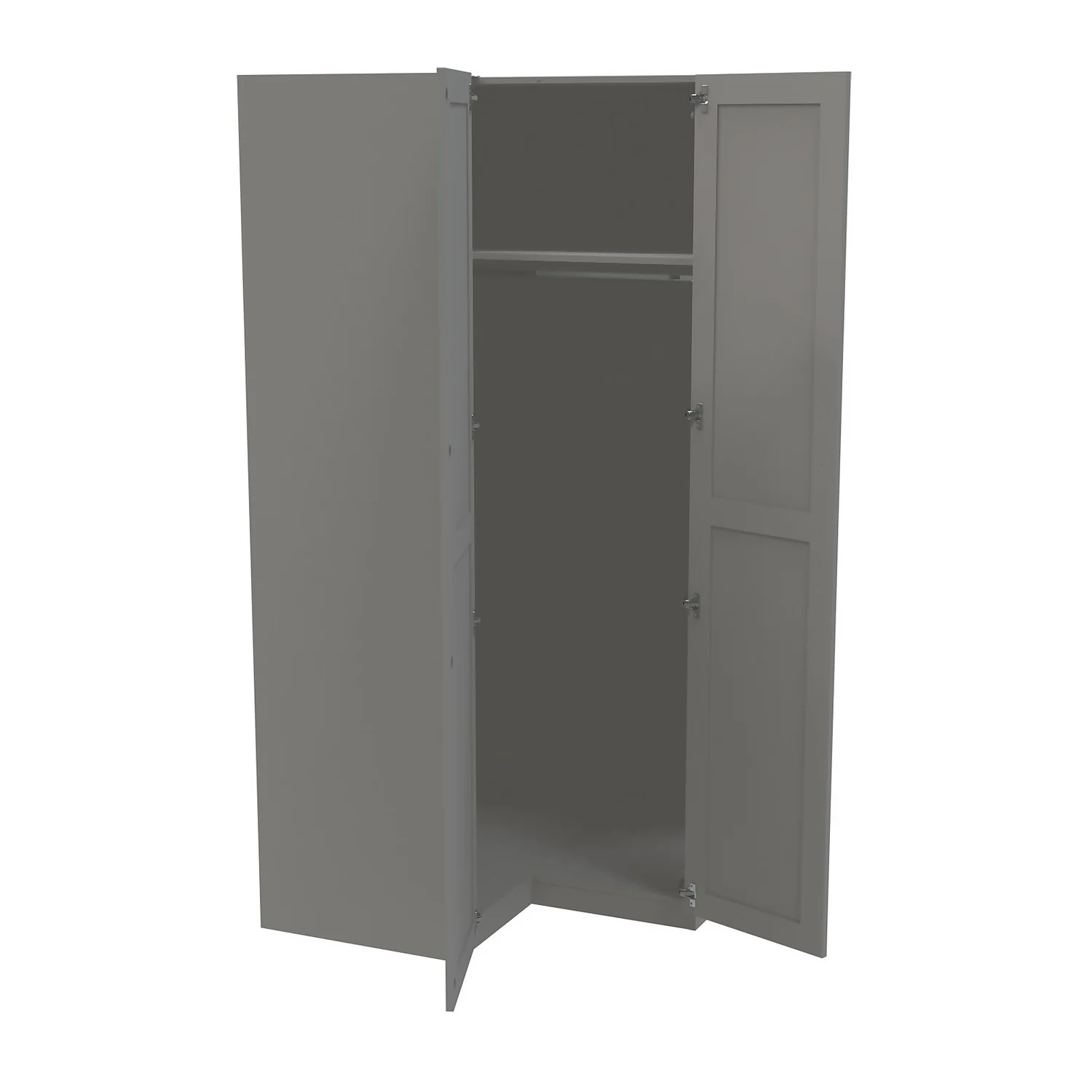 The House Beautiful range is exclusive to Homebase and offers a selection of different finishes and storage configurations to suit your needs. With a range of carcass colours and contrasting door designs, you can select the look to fit your bedroom aesthetic. This corner wardrobe (1 x double unit and corner conversion) features a grey carcass and beautiful shaker doors finished in a luxurious matt grey. The wardrobe features premium soft close clip-on Blum hinges, five shelves and a hanging rail. You can customise your wardrobe with our additional internal storage options (available separately) including internal drawers, shelves, dividing shelves and extra hanging rails. Choose your handles from our range of both traditional and modern to suit your desired look.