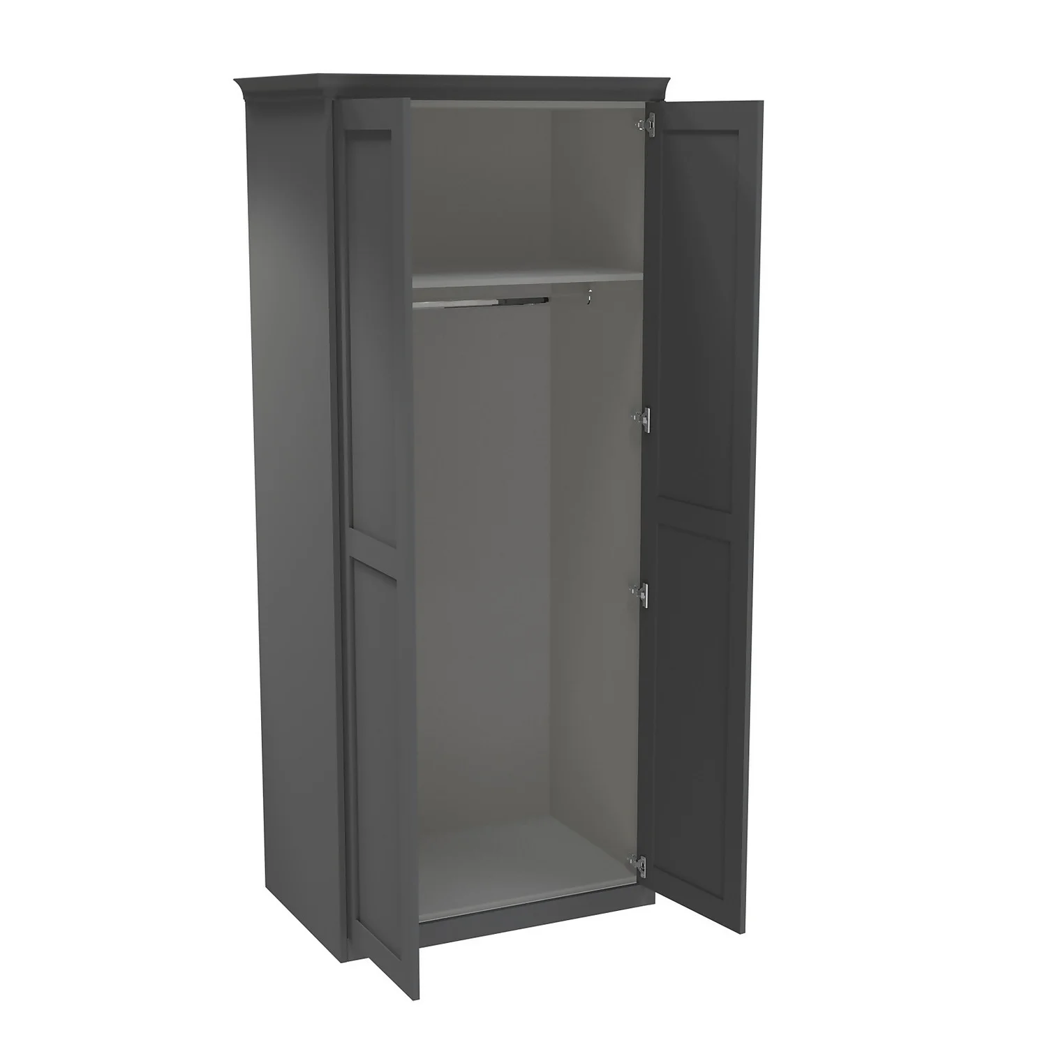 - A fitted look is achieved by using clad on panels, plinth and cornice which are all included with this wardrobe. All the elements that clad the internal grey carcass (clad on panels, plinth and cornice) are a perfect match to the matt carbon grey shaker door
