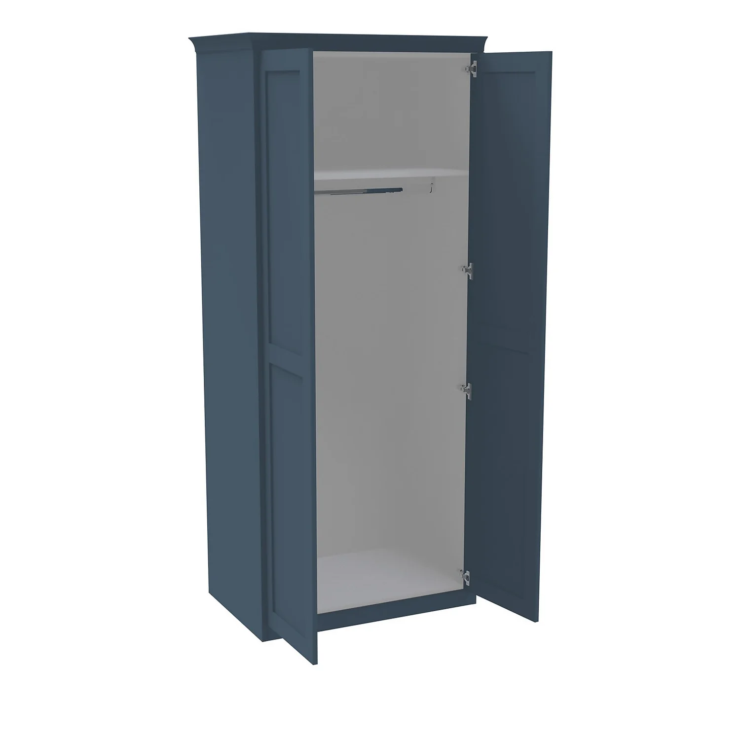 This double wardrobe features a white internal carcass which includes end panels, plinth and matching cornice all in a finish to match the beautiful luxe matt navy blue shaker doors. The wardrobe features premium soft close Blum hinges, a shelf and a hanging rail. You can customise your wardrobe with our additional internal storage options (available separately) including internal drawers, shelves, dividing shelves and extra hanging rails. Choose your handles from our range of both traditional and modern to suit your desired look.