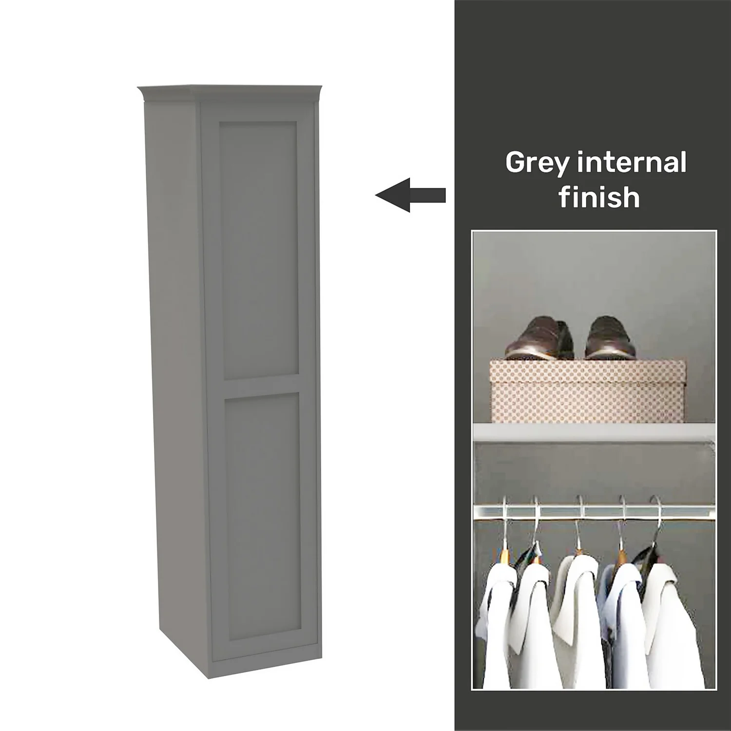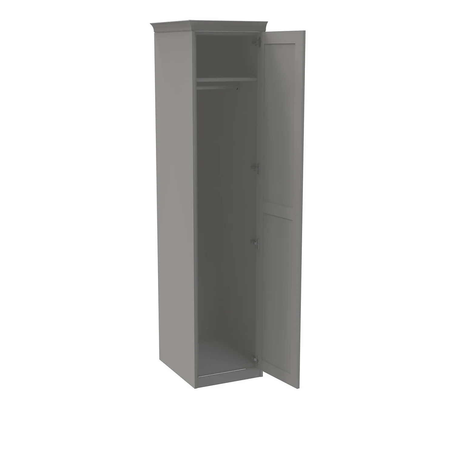 - A fitted look is achieved by using clad on panels, plinth and cornice which are all included with this wardrobe. All the elements that clad the internal grey carcass (clad on panels, plinth and cornice) are a perfect match to the matt grey shaker door