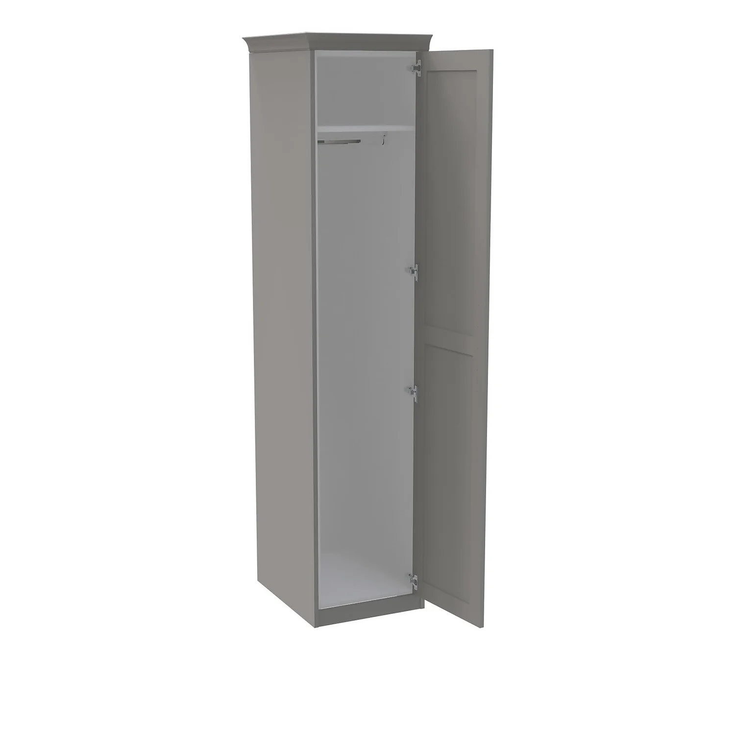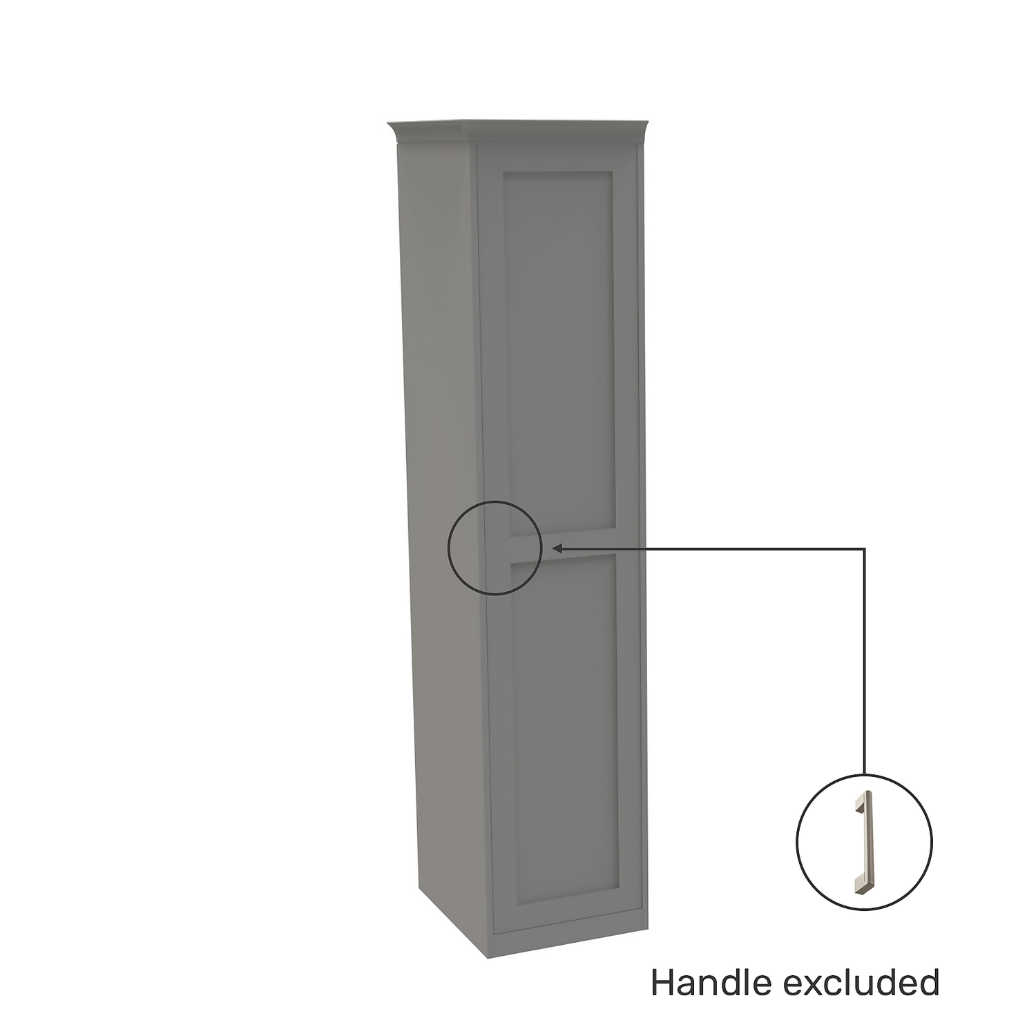 This single wardrobe features a white internal carcass which includes end panels, plinth and matching cornice all in a finish to match the beautiful luxe matt grey shaker door. The wardrobe features premium soft close Blum hinges, a shelf and a hanging rail. You can customise your wardrobe with our additional internal storage options (available separately) including internal drawers, shelves, dividing shelves and extra hanging rails. Choose your handles from our range of both traditional and modern to suit your desired look.